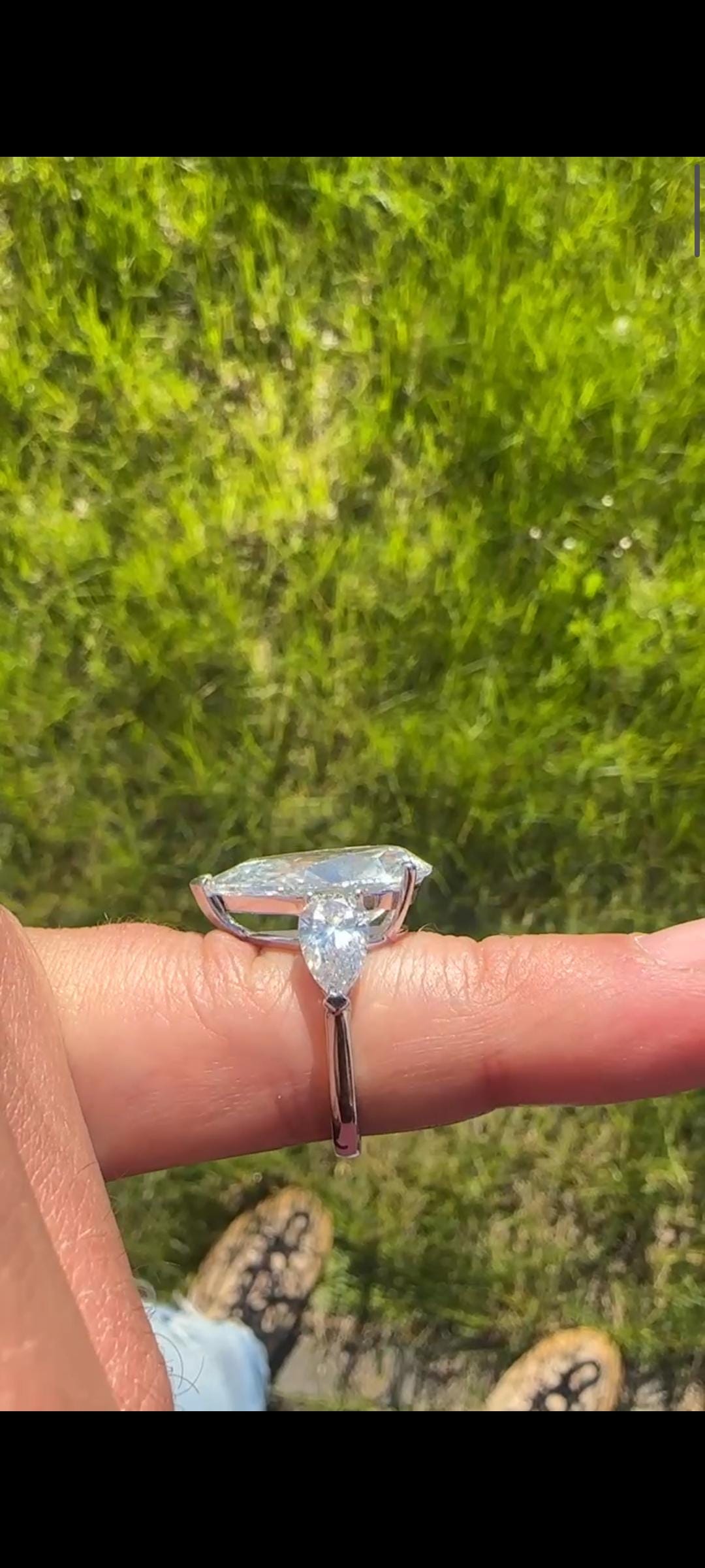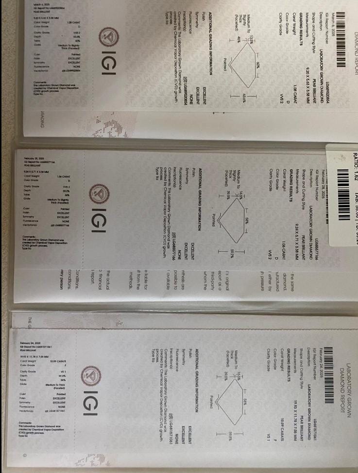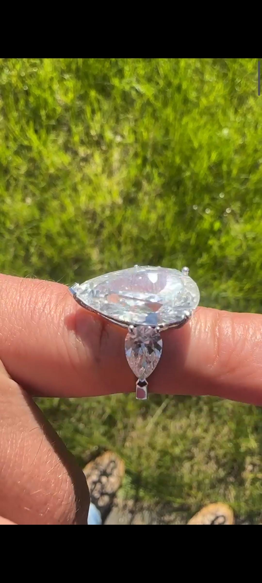 Massive 10.09ct lab grown pear diamond ring with two D VVS2 pear side stones (~12.23ct total) set in 18K white gold. IGI-certified Type IIa CVD diamonds with excellent polish & symmetry and no fluorescence. Made to order with my jeweler in Denmark – please allow 2–3 weeks before insured worldwide shipping. IGI reports included.